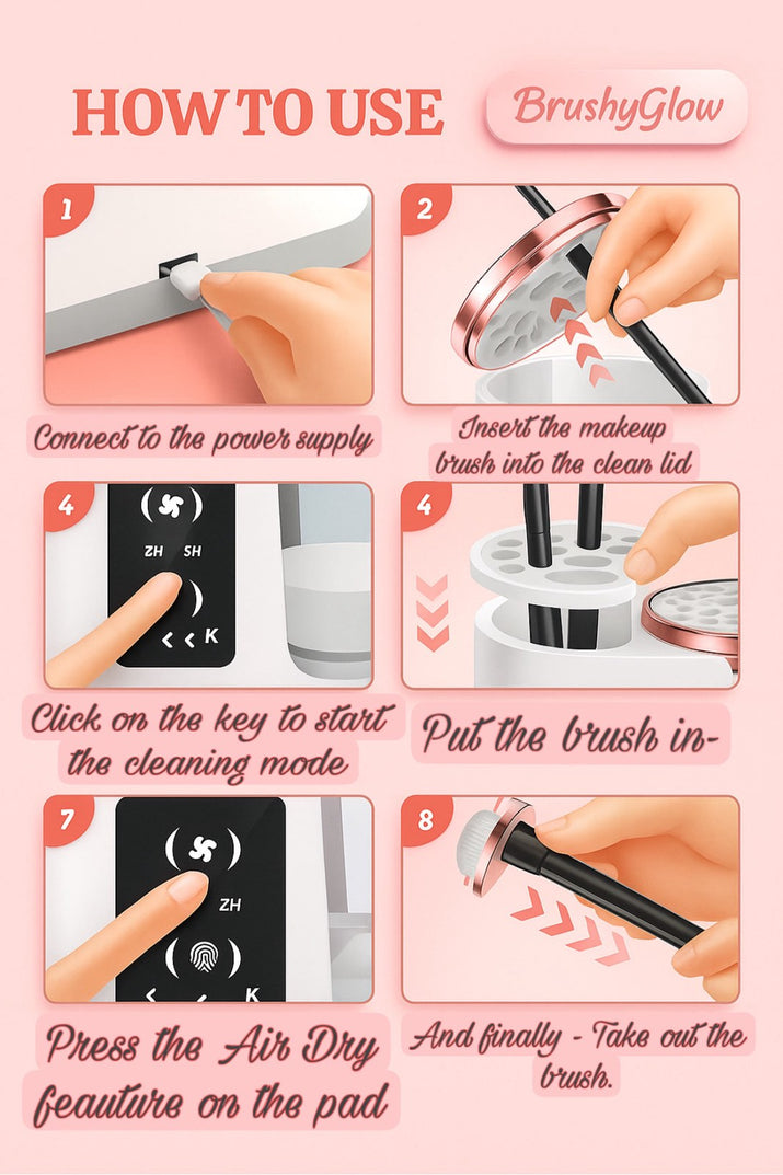 Say goodbye to acne-causing bacteria and dull makeup results. The BrushyGlow Cleaner removes deep makeup residue and bacteria in seconds, keeping your brushes spotless and your skin flawless. With advanced water-powered technology, clean and dry up to 20 brushes in under 30 minutes — no more hand-washing or buying new brushes. Protect your skin, save time, and enjoy smooth, glowing makeup results every single day.